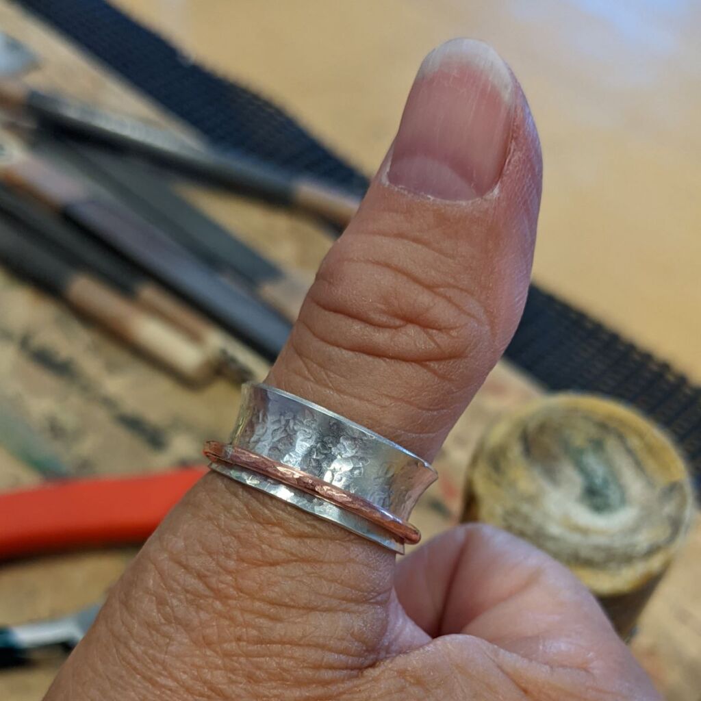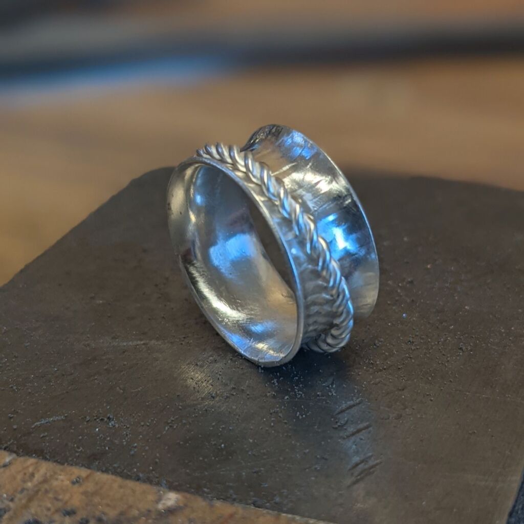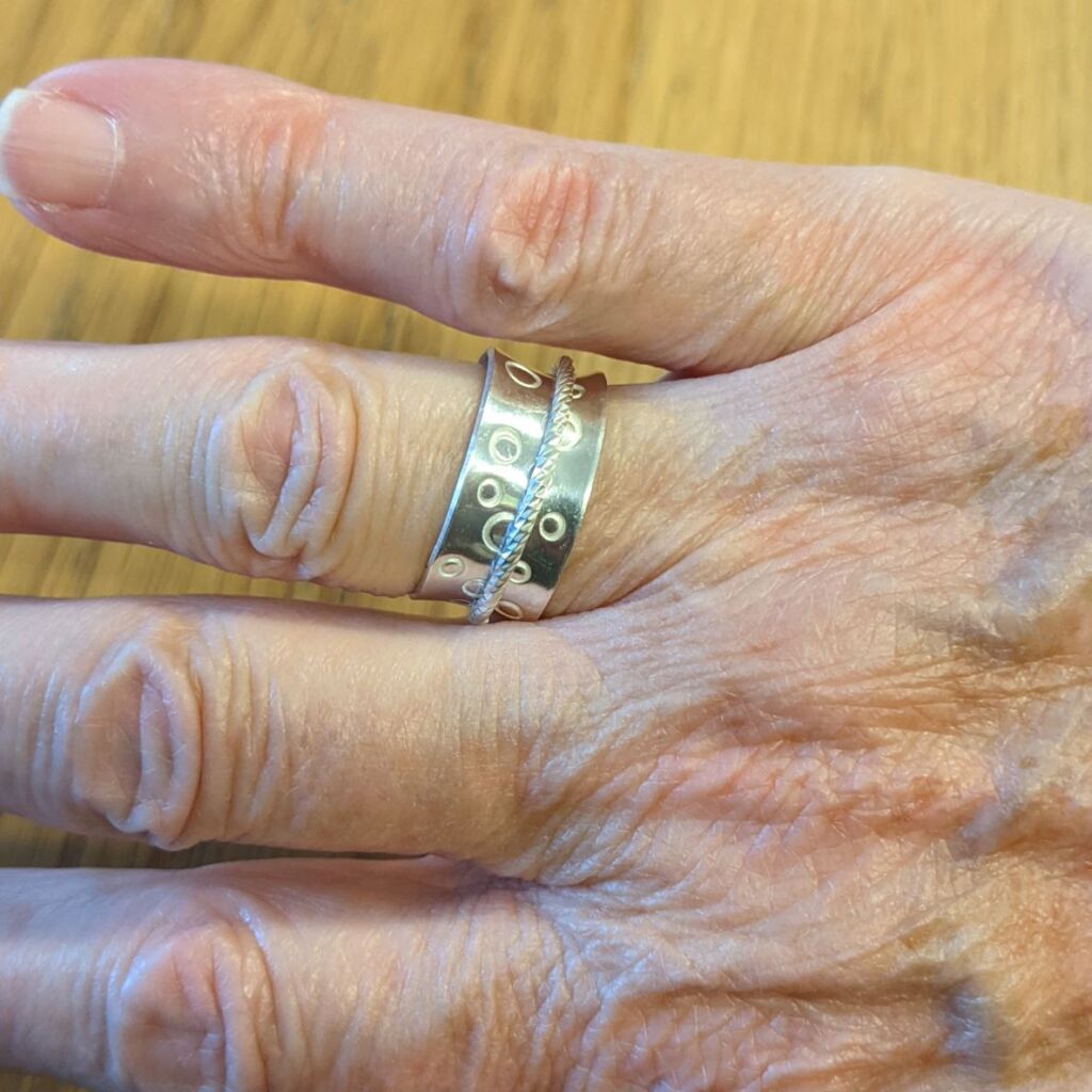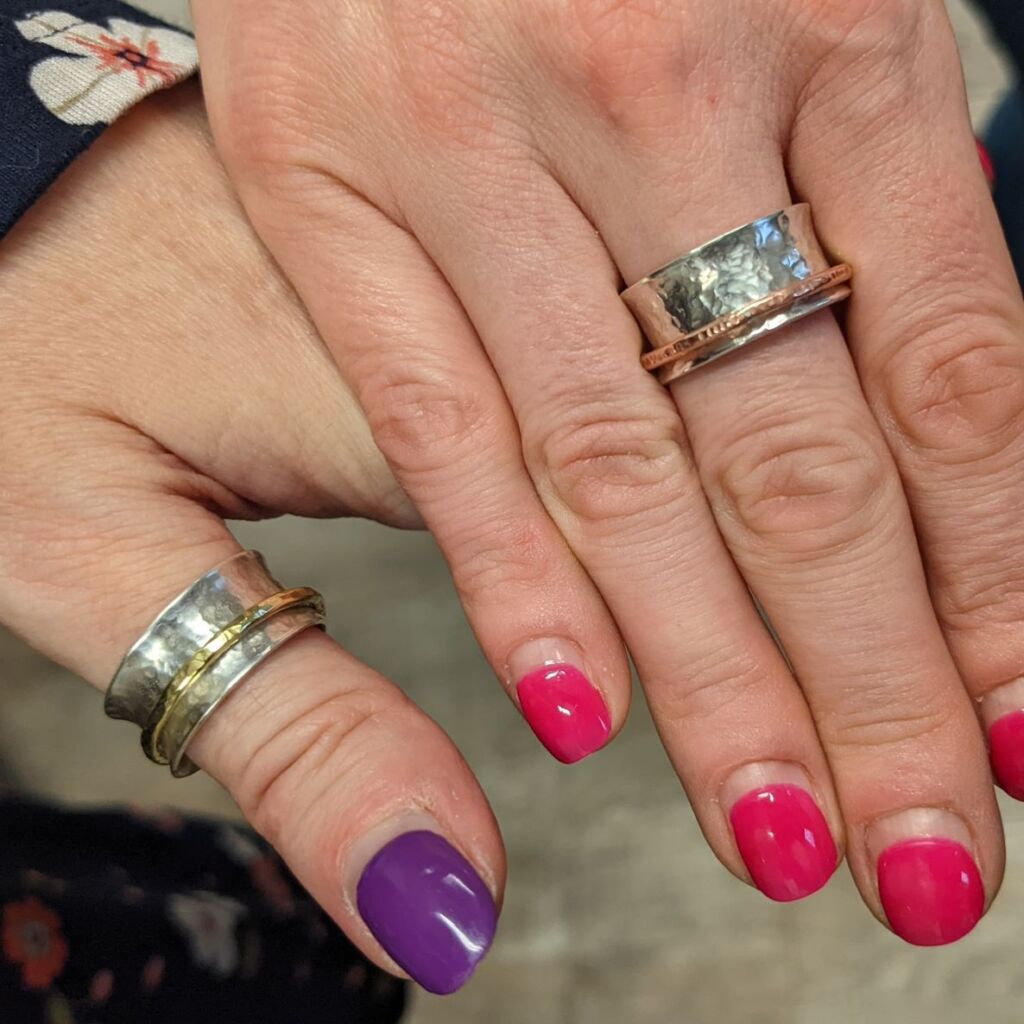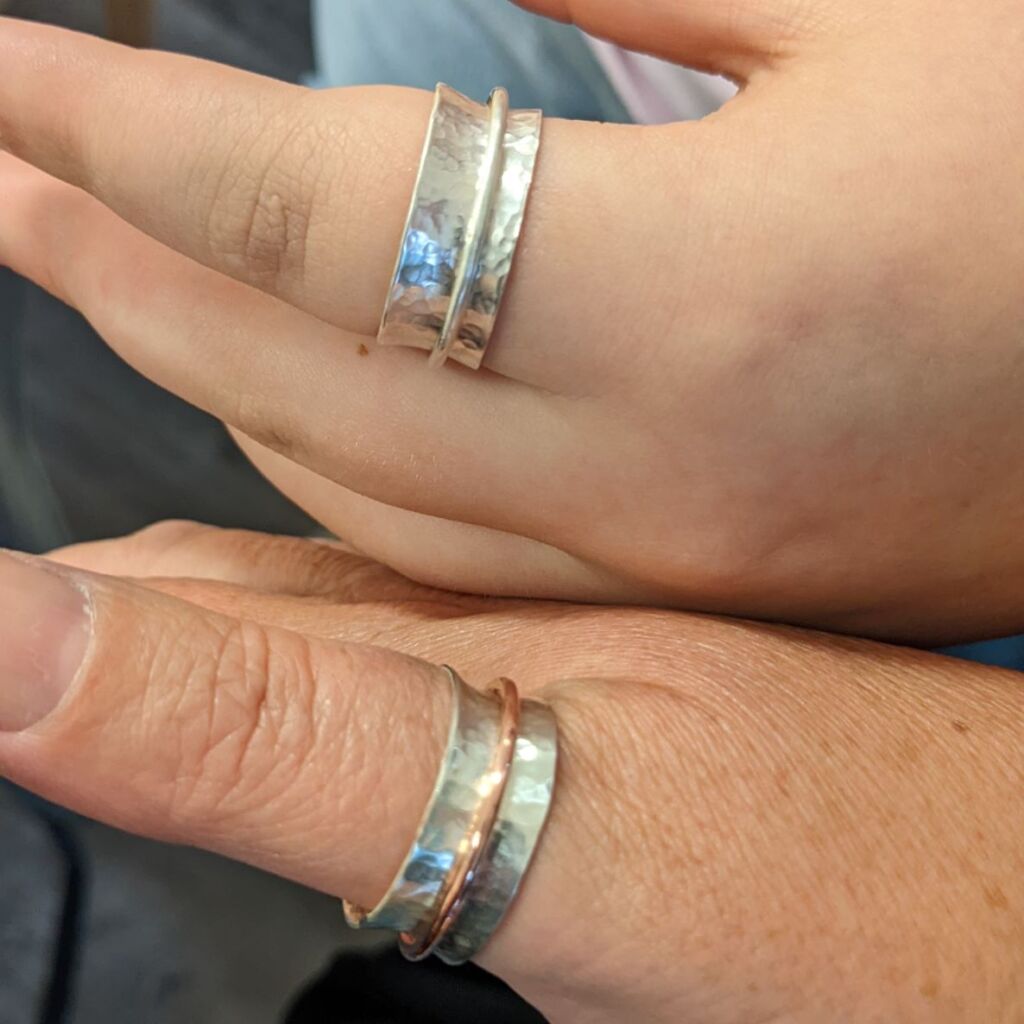 My Spinner Ring Workshops are great fun and make wonderful gift ideas! No previous experience jewellery making is necessary to take part as full instruction is given. In this workshop each participant will produce a sterling silver spinner (or ‘fidget’) ring; a wide, textured silver band with a narrower, free moving ring ‘trapped’ on the outside. The workshop is completely hands-on, with each stage of the ring making process being done by the participant themselves (though of course I will always be on hand to help where needed!). Scroll through the photos to see some of the fabulous rings made in previous spinner ring workshops!
