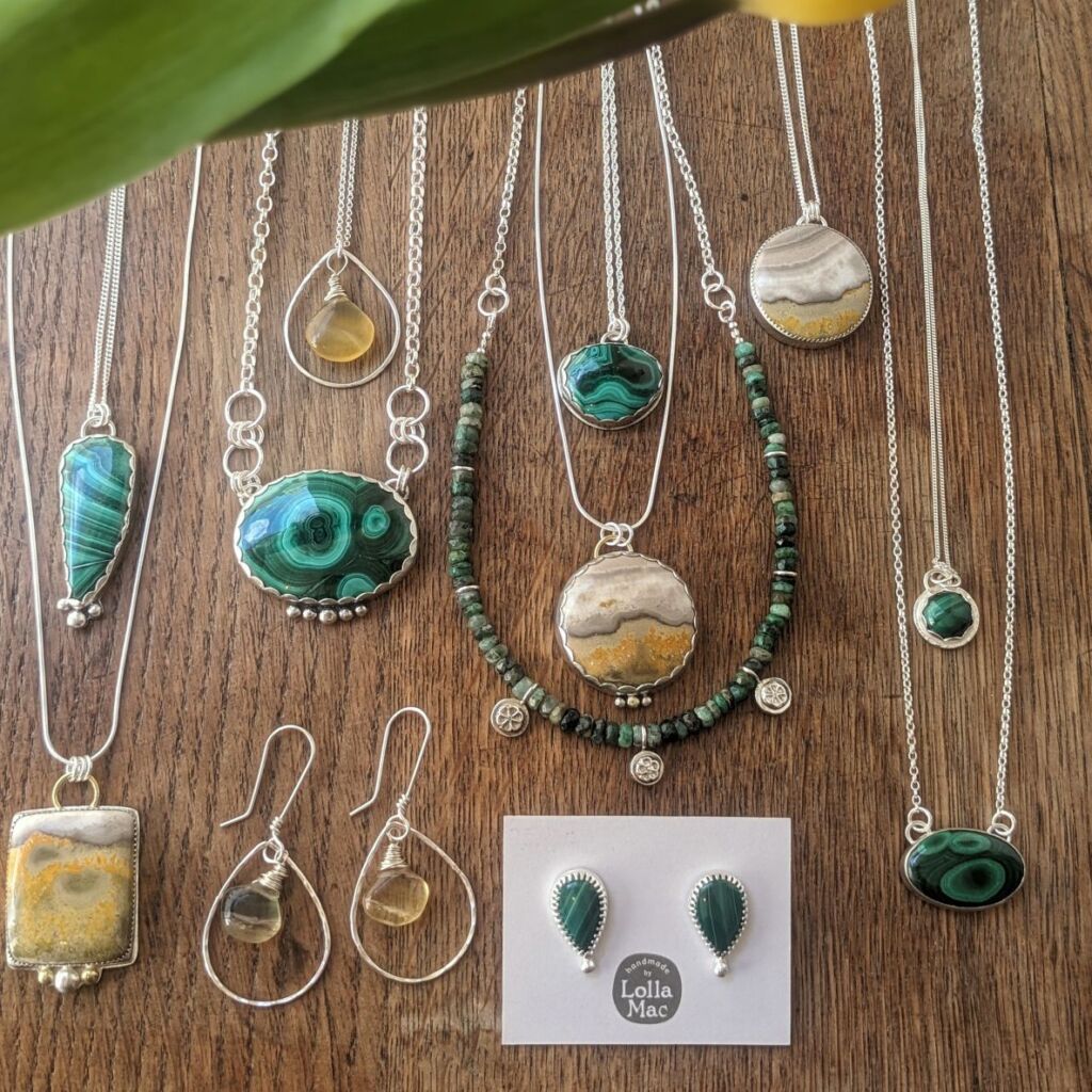 A selection of malachite and emeralds providing beautiful shades of green, with the yellows coming courtesy of pretty fluorite and stunning bumblebee jasper, all set in sterling silver. As always with my seasonal collections, each piece is a one-of-a-kind, so when they’re gone that’s it!