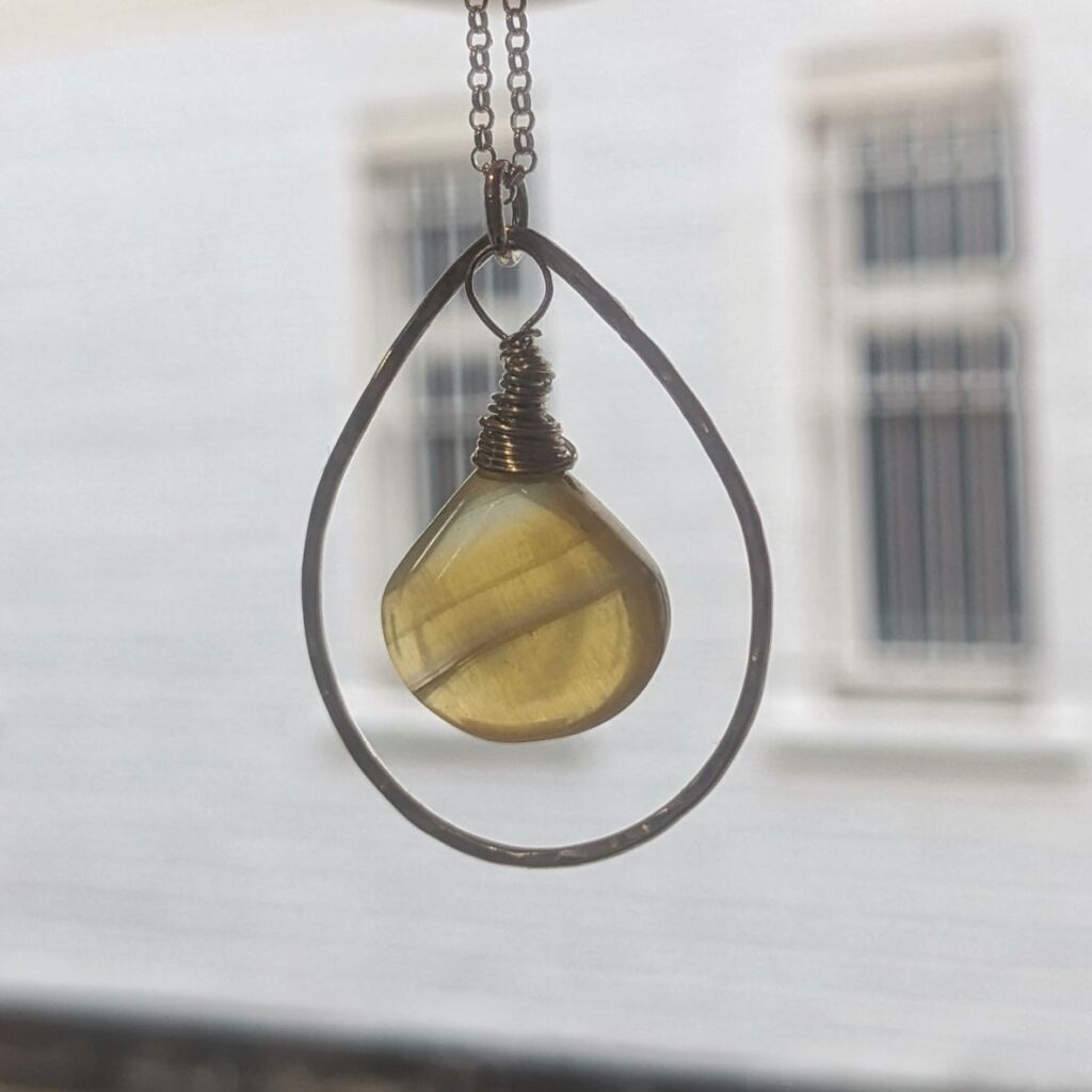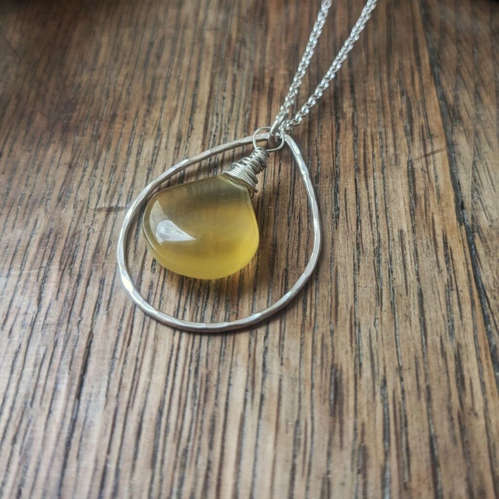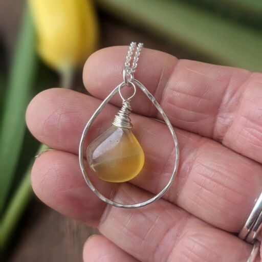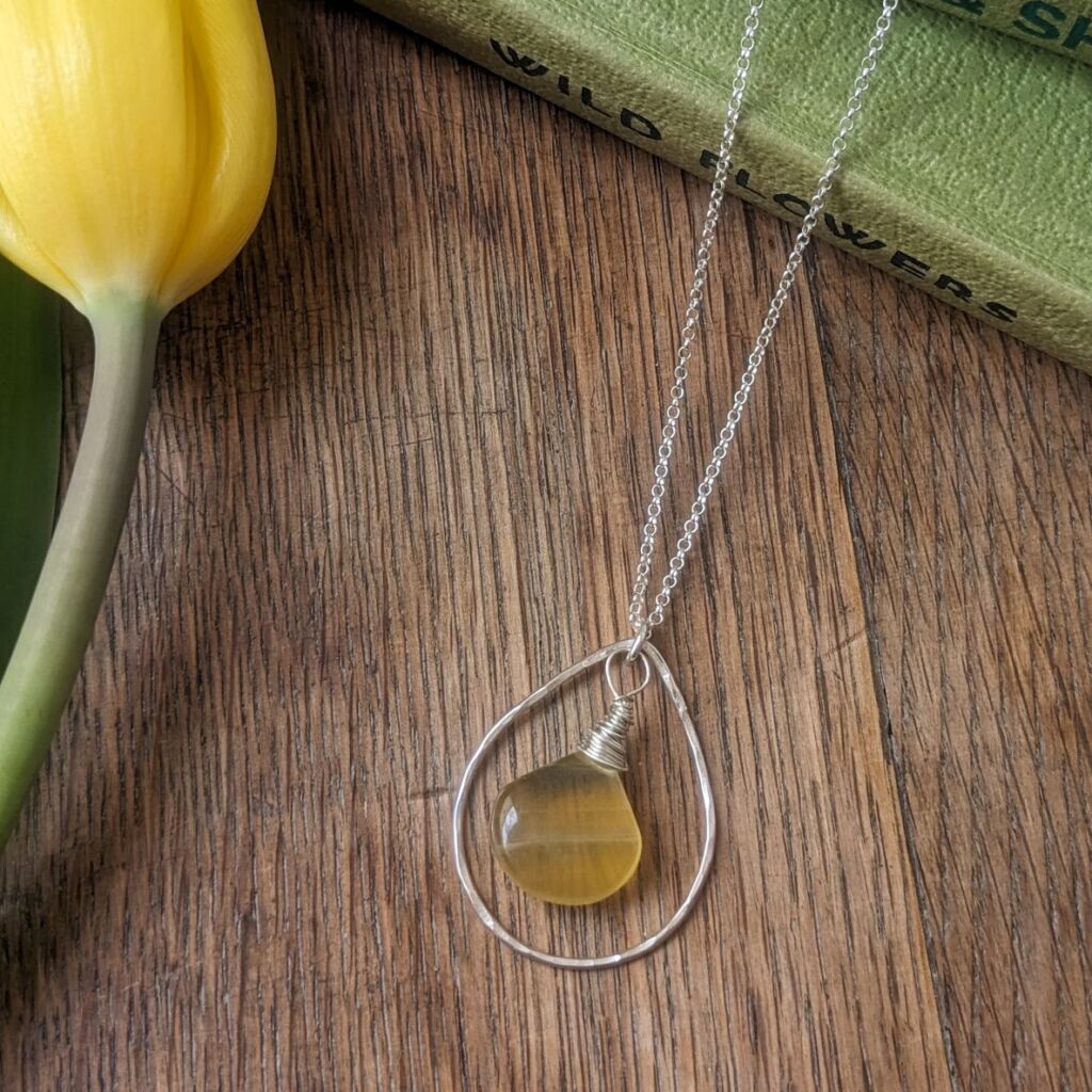 This pretty pendant features a lovely briolette cut fluorite gemstone at its centre. The shape of the stone is mirrored by the teardrop hoop of sterling silver which surrounds it. The silver hoop has been lightly hammered for a sparkly, textured finish. The yellow colour of the fluorite with its pretty green stripe is completely natural, and brings to mind a springtime landscape filled with yellow daffodils. The pendant is completed with a sterling silver belcher chain.